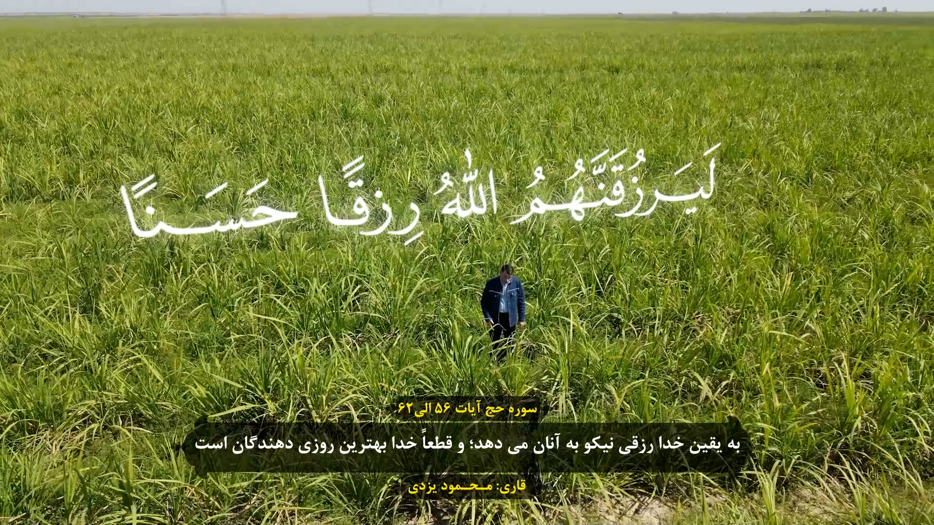 تلاوت آیاتی چند از سوره «حج» توسط محمود یزدی از صدا و سیمای مرکز خوزستان پخش شد و مردم در این روزهای مبارک ماه رمضان در حالی که گوش جان به نغمههای آسمانی قرآن سپرده بودند، عظمت و زیبایی طبیعت را در پهنه مزارع سرسبز نیشکر به نظاره نشستند.