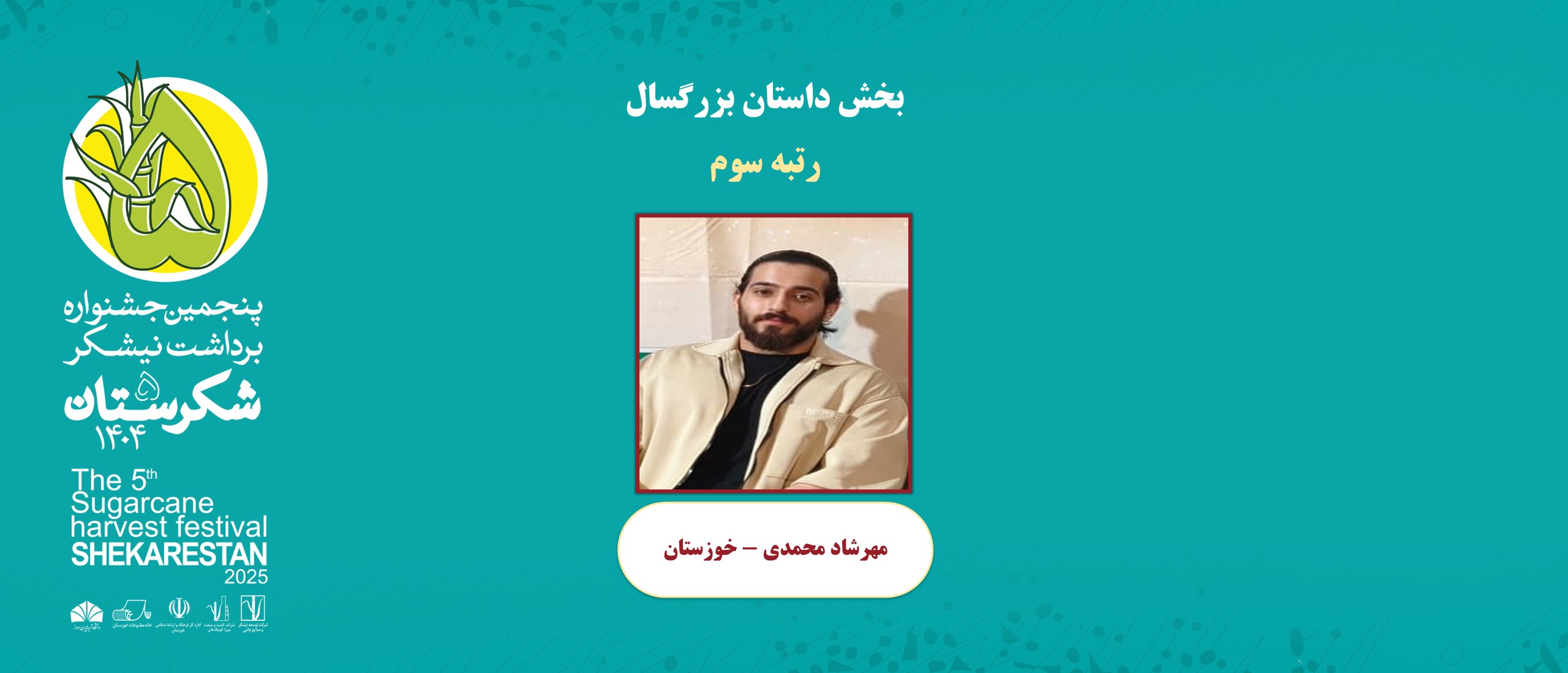 در بخش داستان کوتاه بزرگسال نیز عاطفه خضیری، پوران نوروزی و مهرشاد محمدی از خوزستان در جایگاه اول تا سوم قرار گرفتند. در این بخش از زینب جلیلیان، سارا محمدی و نرگس محمدی به عنوان شایستگان تقدیر، قدردانی شد.
