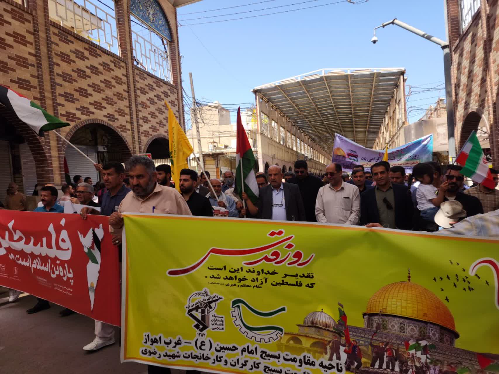 گامها آرام، اما استوار برداشته میشد و نجوای یکصدای «اتحدوا اتحدوا»، زیر پرچم سه رنگ ایران و بیرقهای زرد حزبالله، تماشایی بود. در آخرین جمعه ماه مبارک رمضان، همه آمده بودند؛ پدری دست در دست فرزند چند سالهاش به سمت وعدهگاه حرکت میکرد. مادرانی با کودکانی در آغوش، همقدم با خانواده، به سیل جمعیت پیوستند و در هوای بهاری اهواز، در میانه جنبش پرچمها و مشتهای گره کرده، نمایی از اتحاد علیه رژیم غاصب را به تصویر کشیدند.