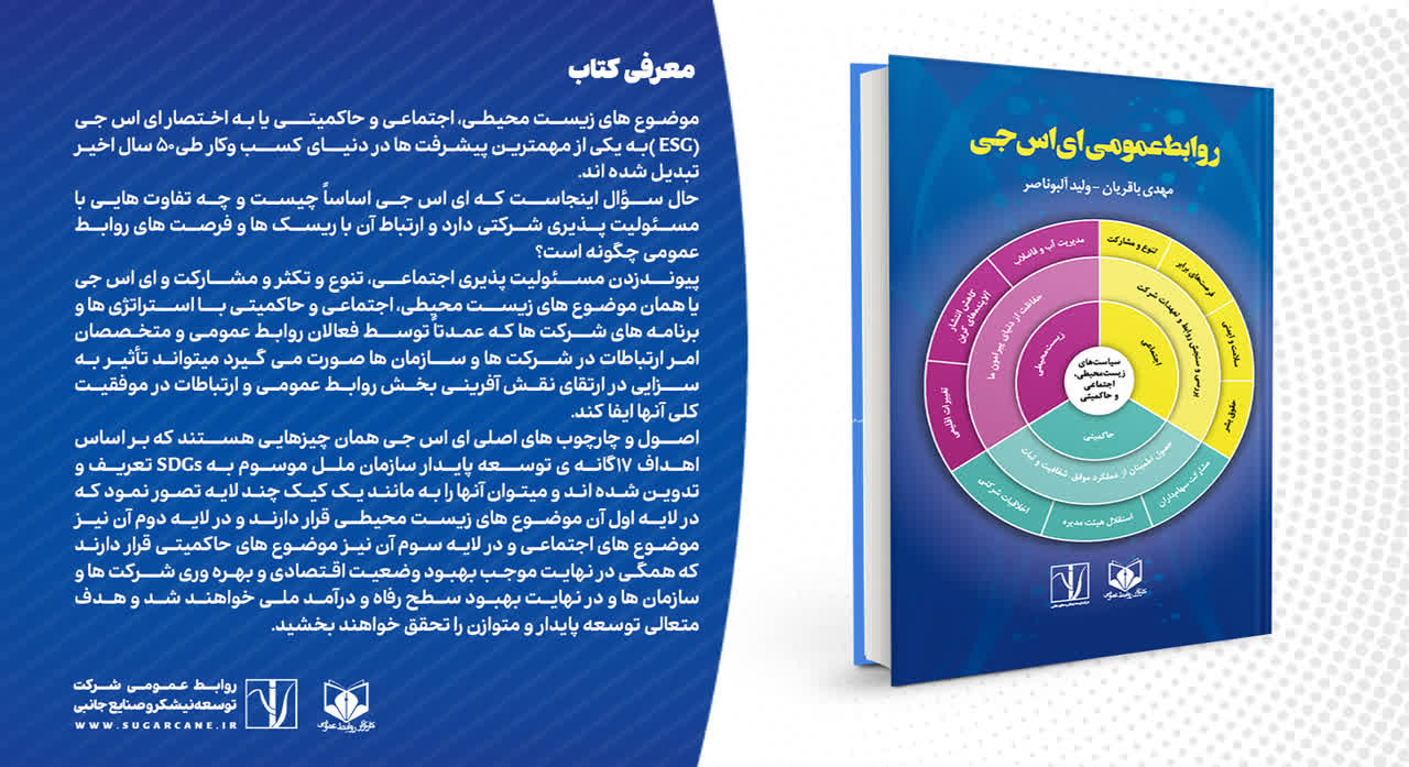 به گزارش روابطعمومی شرکت توسعه نیشکر و صنایع جانبی، این کتاب دربرگیرنده موضوعاتی در حوزه محیطزیست، مسئولیتهای اجتماعی و حاکمیتی شرکتهاست و نقش روابطعمومیها در ایجاد قدمهای مبتنی بر توسعه پایدار در این سه حوزه به تشریح بیان شده است.