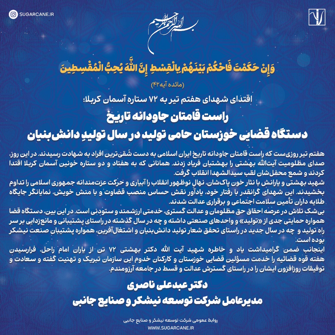 اینجانب ضمن گرامیداشت یاد و خاطره شهید آیت الله دکتر بهشتی ۷۲ تن از یاران امام راحل، فرارسیدن هفته قوه قضائیه را خدمت مسؤلین قضایی خوزستان و کارکنان خدوم این سازمان تبریک و تهنیت گفته و سعادت و توفیقات روزافزون ایشان را در راستای گسترش عدالت و قسط در جامعه آرزومندم.